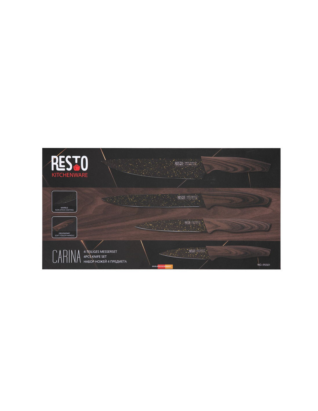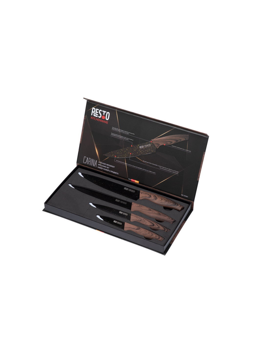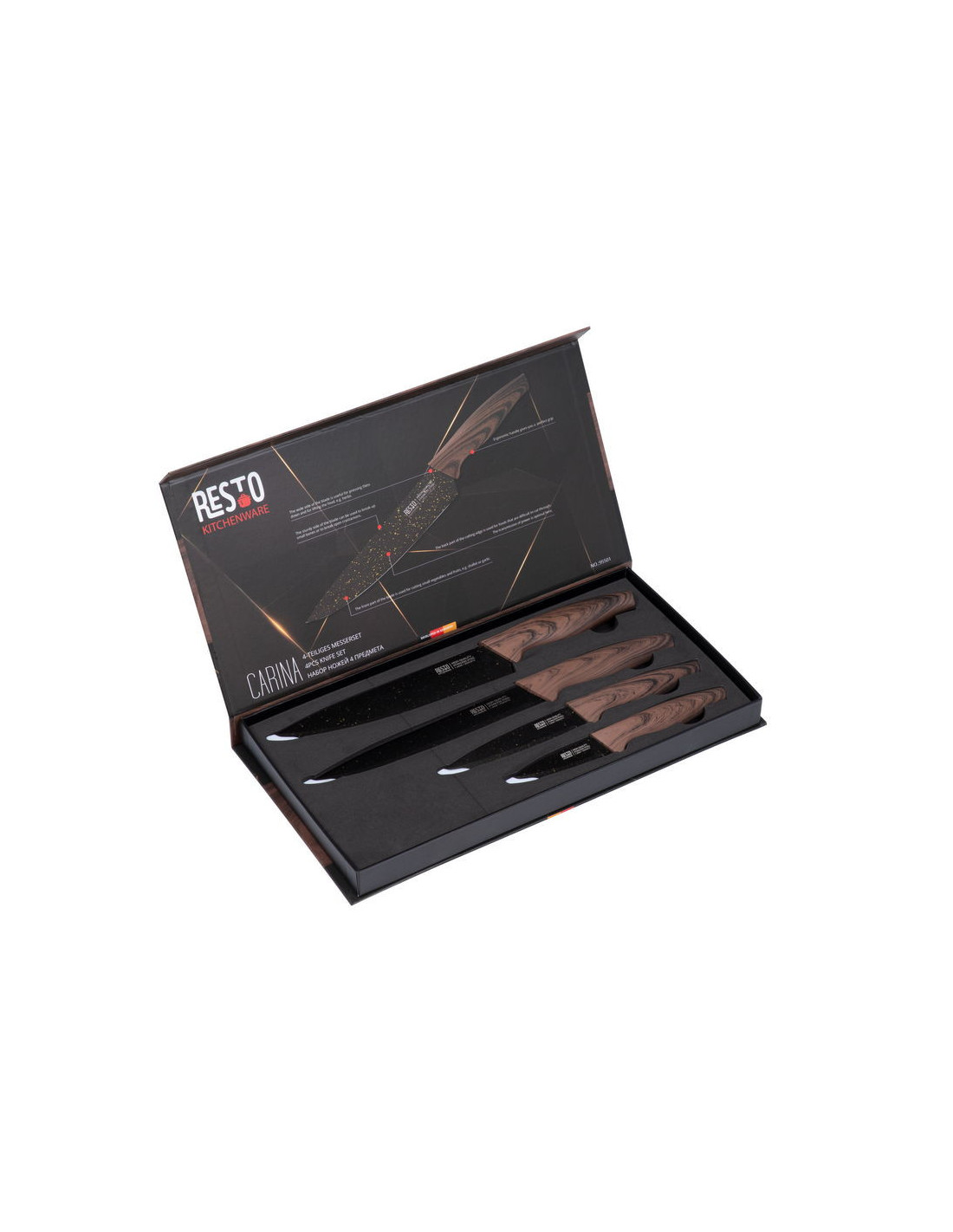 Con los cuchillos Carina de Resto, no solo obtienes precisión y eficacia en cada corte, sino también una superficie antibacteriana para mantener tu cocina segura y libre de impurezas. Diseño excepcional, funcionalidad impecable y una adición elegante a cualquier cocina.