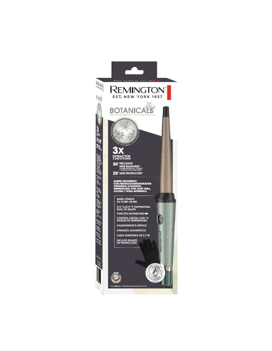 El rizador Remington Botanicals aprovecha los elementos que se encuentran en la naturaleza. Su barril recubierto de microacondicionador cerámico avanzado, enriquecido con extracto de aloe vera, jojoba y rosa mosqueta, brinda rizos hermosos y definidos. El rizador cuenta con nuestro suave ajuste de temperatura BotaniCare que ayuda a proteger tu cabello al estilizarlo a una temperatura más baja, de 185 °C. Además, cuenta con controles digitales de temperatura con 10 Ajustes de 130 °C 210 °C para que puedas encontrar el nivel de calor perfecto para tu tipo de cabello.