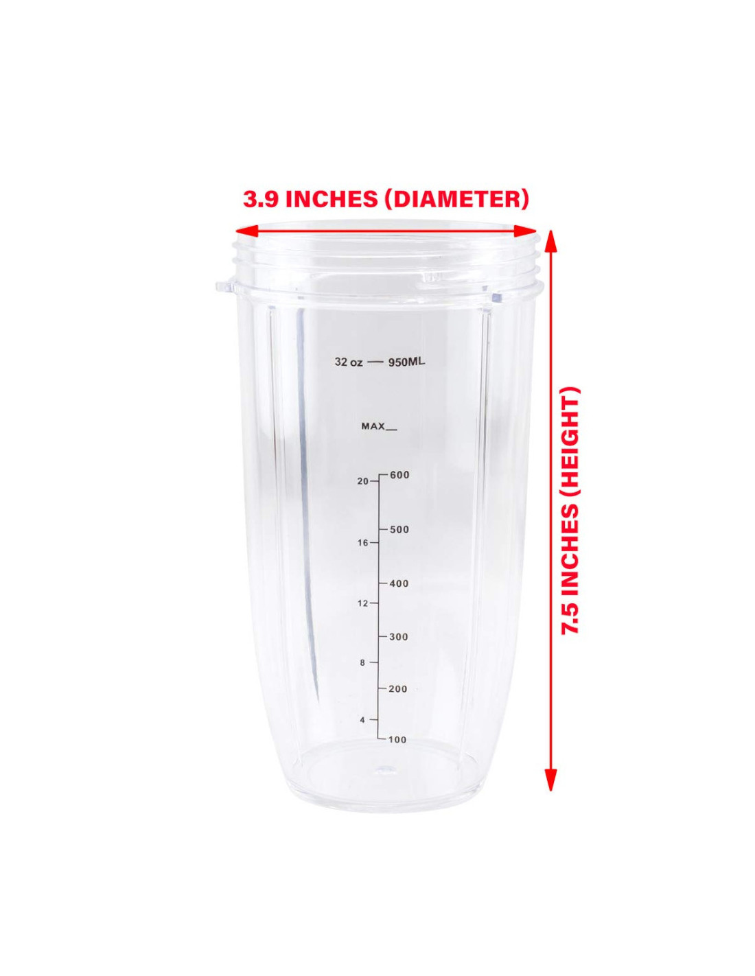 Pieza de repuesto de vaso colosal de 32 onzas de altura compatible con licuadoras Nutri Bullet 600W 900W NB-101B NB-101S NB-201. El paquete contiene: 1 (uno) reemplazo de taza de 32 onzas.Dimensiones de la taza: 7.5 pulgadas (altura) x 3.9 pulgadas (diámetro); capacidad de la taza: 32 onzas.