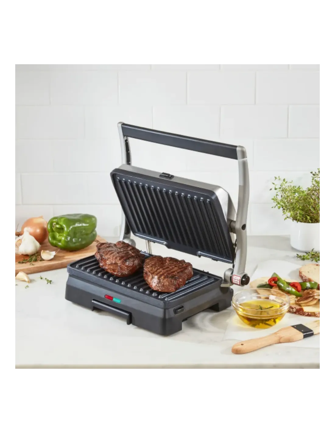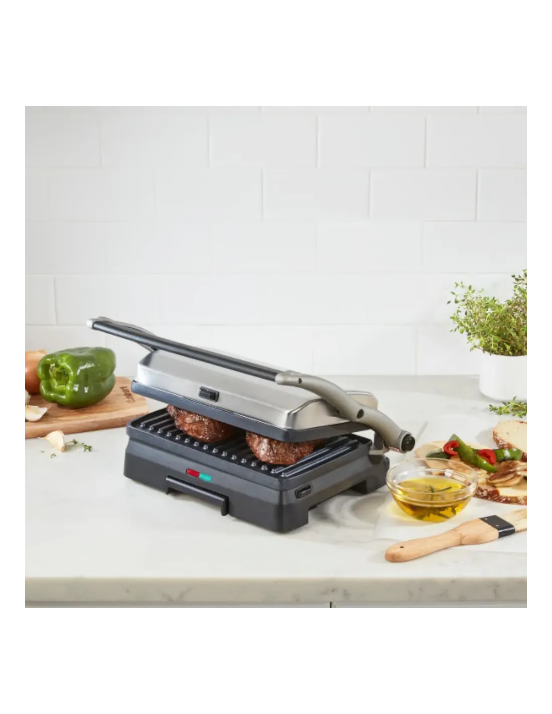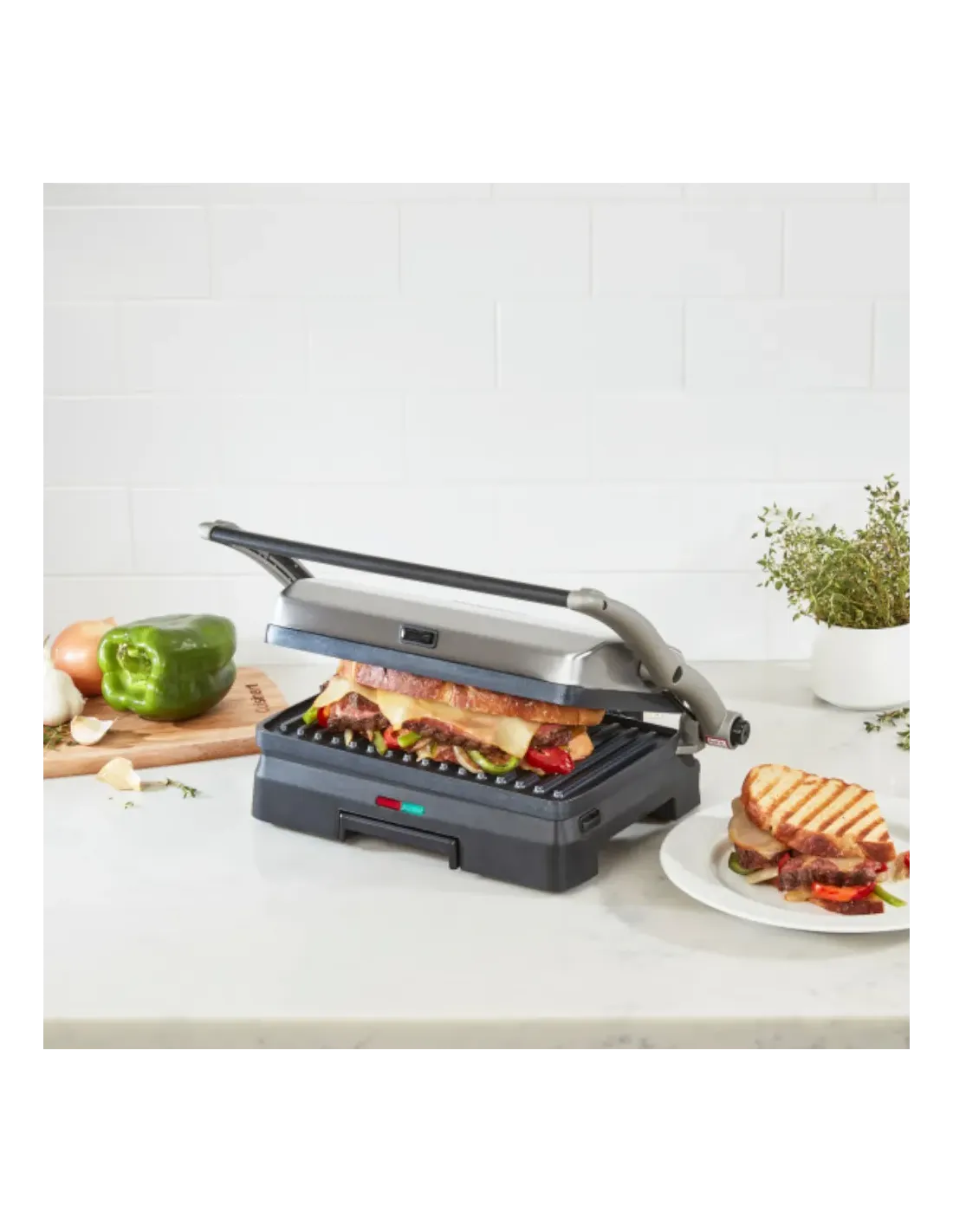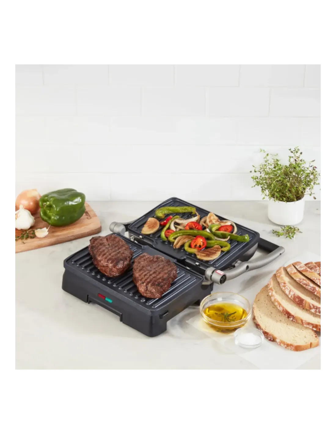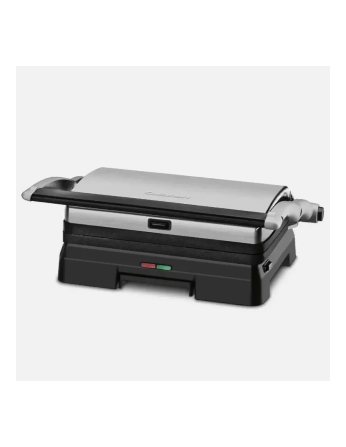 Para obtener filetes jugosos, hamburguesas jugosas y sándwiches crujientes a la parrilla, elija la plancha para parrilla y panini Griddler® de Cuisinart®. Las dos placas de parrilla se pueden usar para planchar paninis y otros sándwiches, y también se abren completamente para duplicar la superficie de cocción y convertirla en una práctica parrilla de mesa. La temperatura preestablecida está optimizada para asar, eliminando las dudas al cocinar, para que pueda concentrarse en el resto de la comida. Y cuando su plato esté listo, ¡la limpieza es facilísima, ya que las placas de parrilla extraíbles son aptas para lavavajillas! Con los indicadores luminosos de encendido y listo para cocinar, ¡el funcionamiento es muy sencillo!