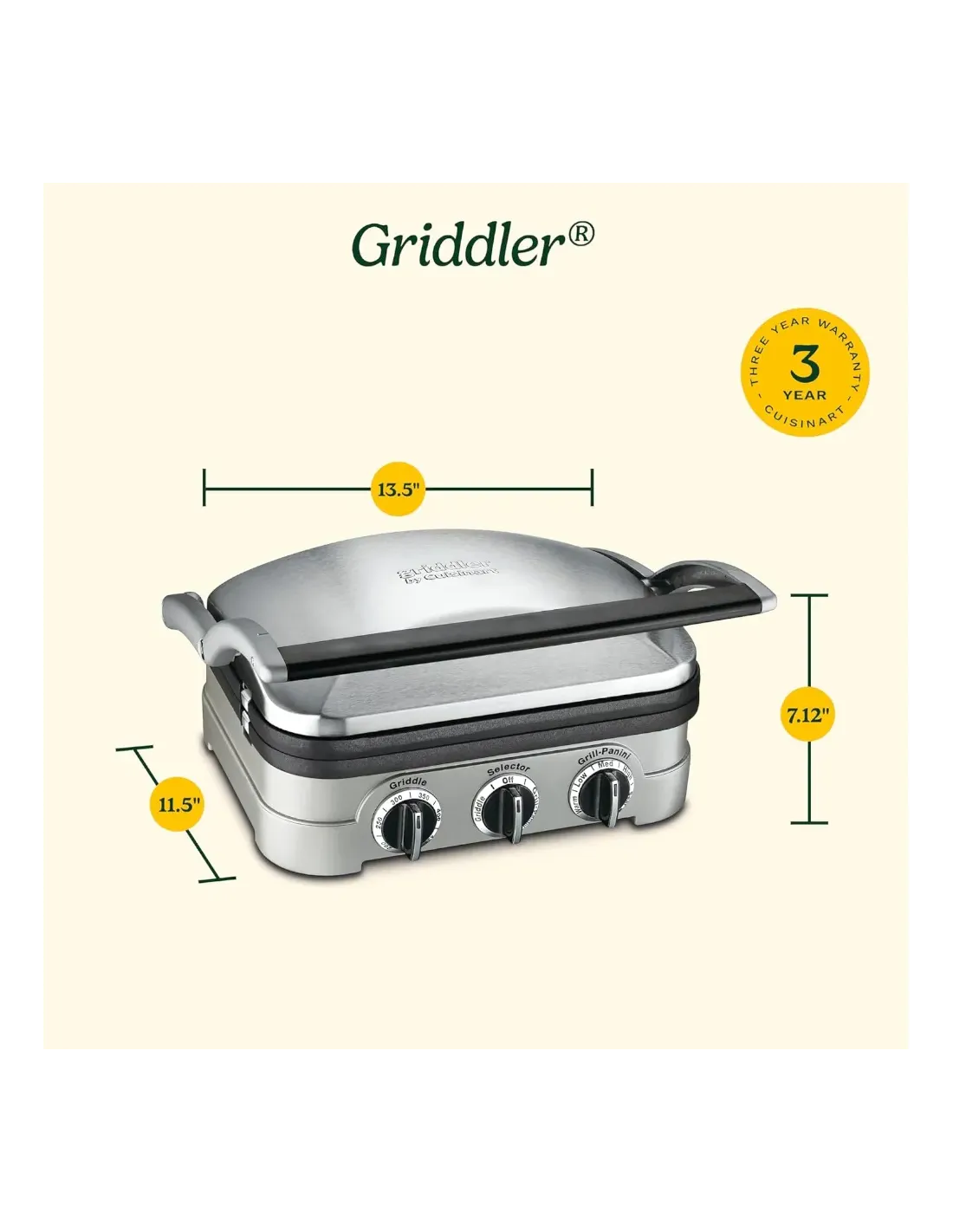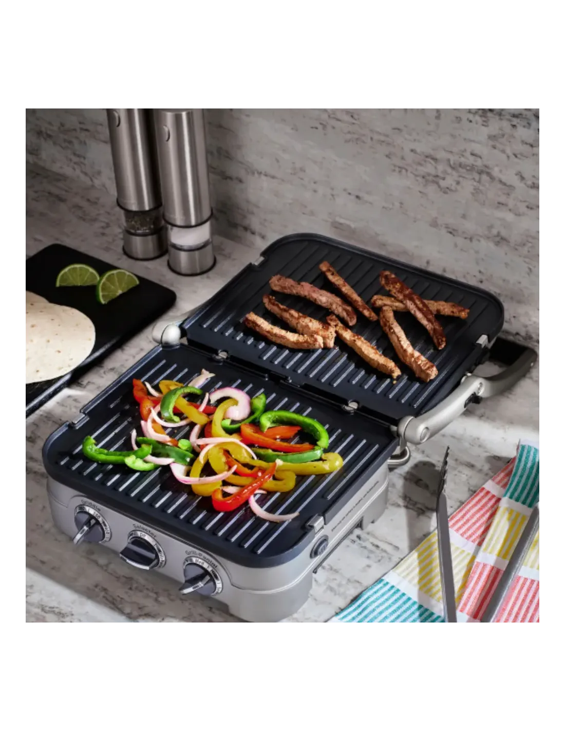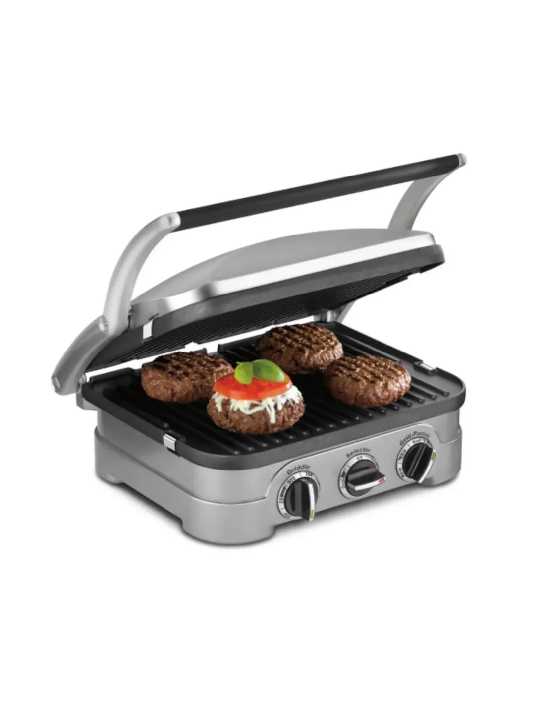 Con cinco opciones de cocción independientes, la Griddler® de Cuisinart® puede cocinar de todo, desde panqueques y salchichas hasta sándwiches de queso a la plancha, filetes, hamburguesas y paninis. Una tapa flotante y un juego de placas reversibles convierten la Griddler® en una parrilla de contacto, prensa para paninis, parrilla completa, plancha completa o mitad parrilla/mitad plancha. Los controles de temperatura duales garantizan una cocción perfecta en todo momento en las placas antiadherentes extraíbles y aptas para lavavajillas, lo que facilita las comidas y la limpieza.