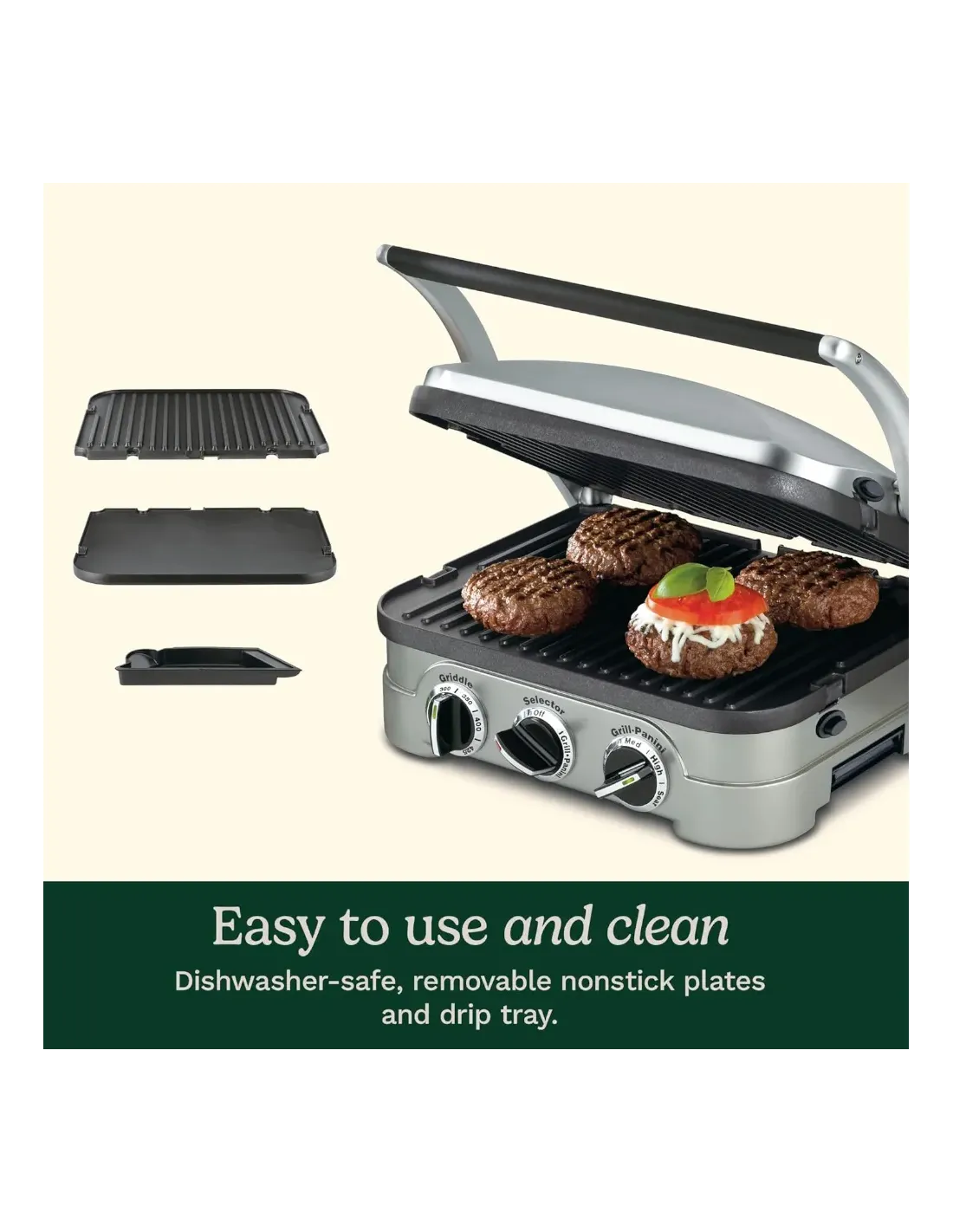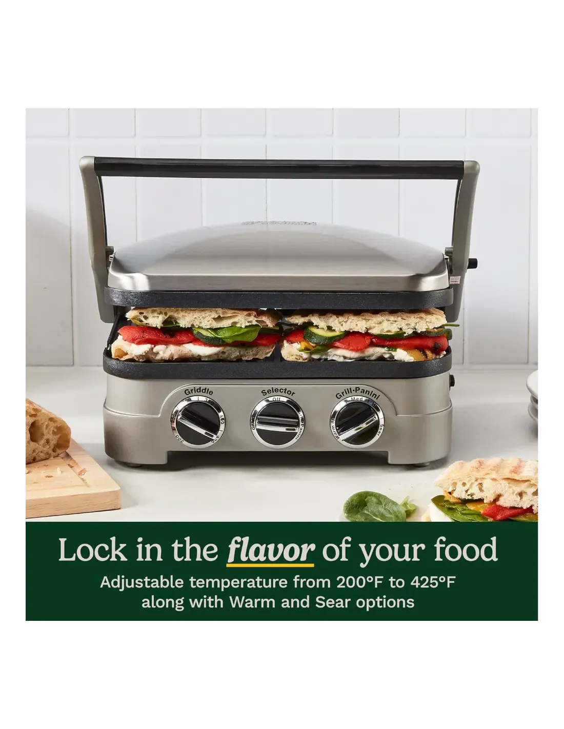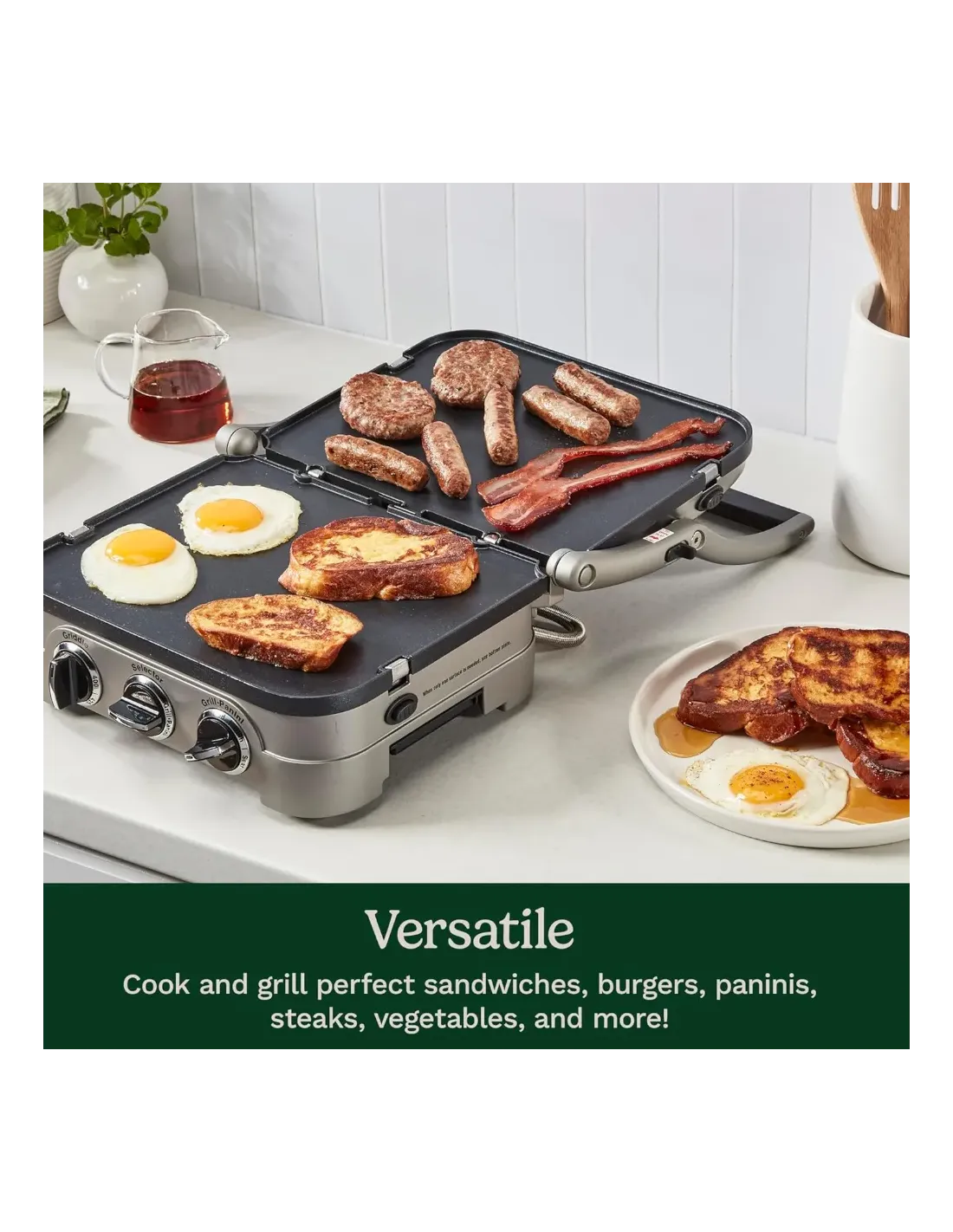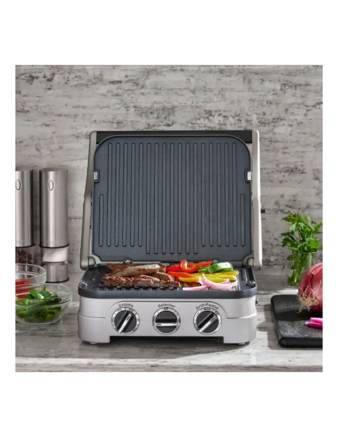 Con cinco opciones de cocción independientes, la Griddler® de Cuisinart® puede cocinar de todo, desde panqueques y salchichas hasta sándwiches de queso a la plancha, filetes, hamburguesas y paninis. Una tapa flotante y un juego de placas reversibles convierten la Griddler® en una parrilla de contacto, prensa para paninis, parrilla completa, plancha completa o mitad parrilla/mitad plancha. Los controles de temperatura duales garantizan una cocción perfecta en todo momento en las placas antiadherentes extraíbles y aptas para lavavajillas, lo que facilita las comidas y la limpieza.
