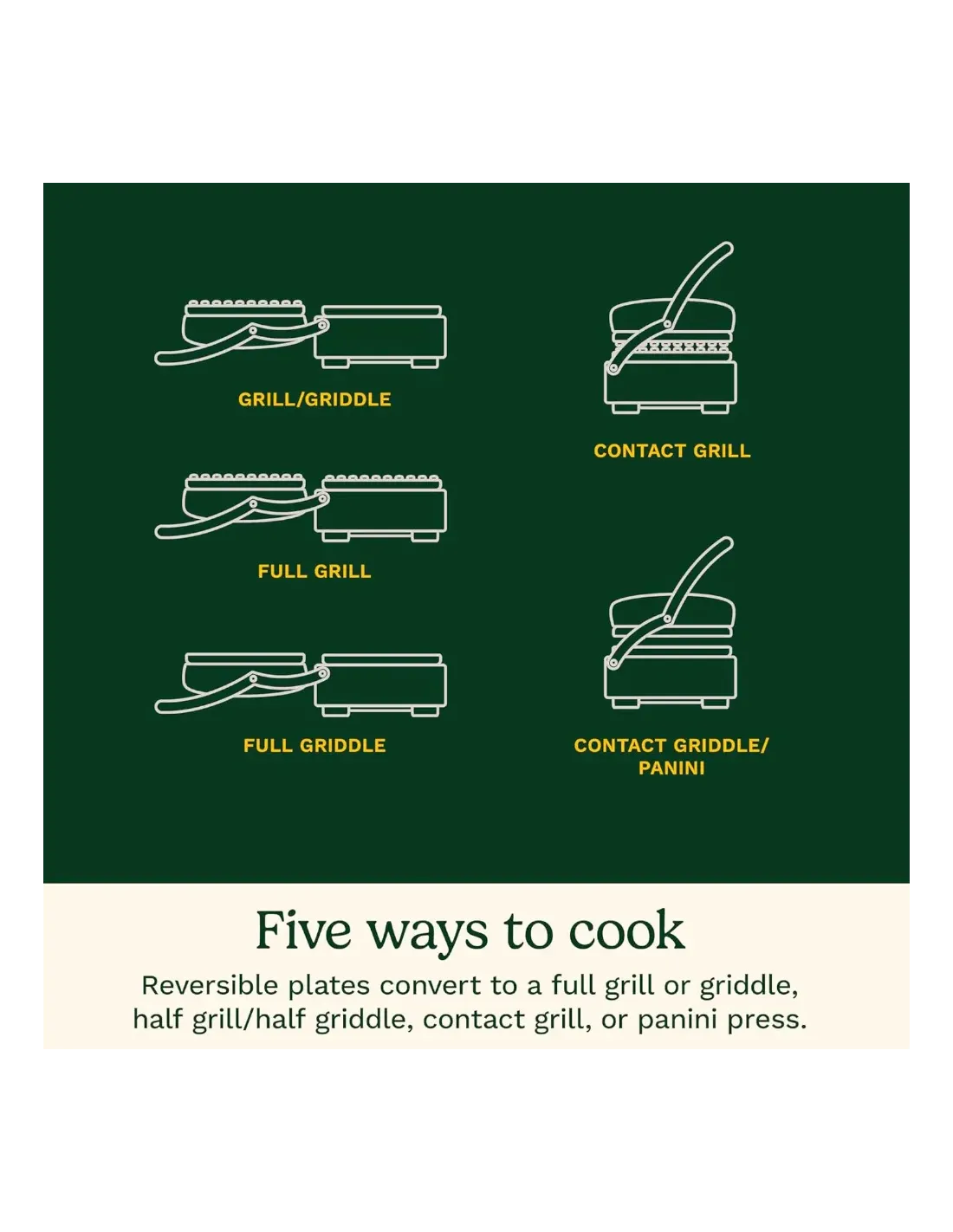 - 5 formas de asar: placas reversibles que se convierten en una parrilla o plancha completa, mitad parrilla/mitad plancha, parrilla de contacto y prensa para panini