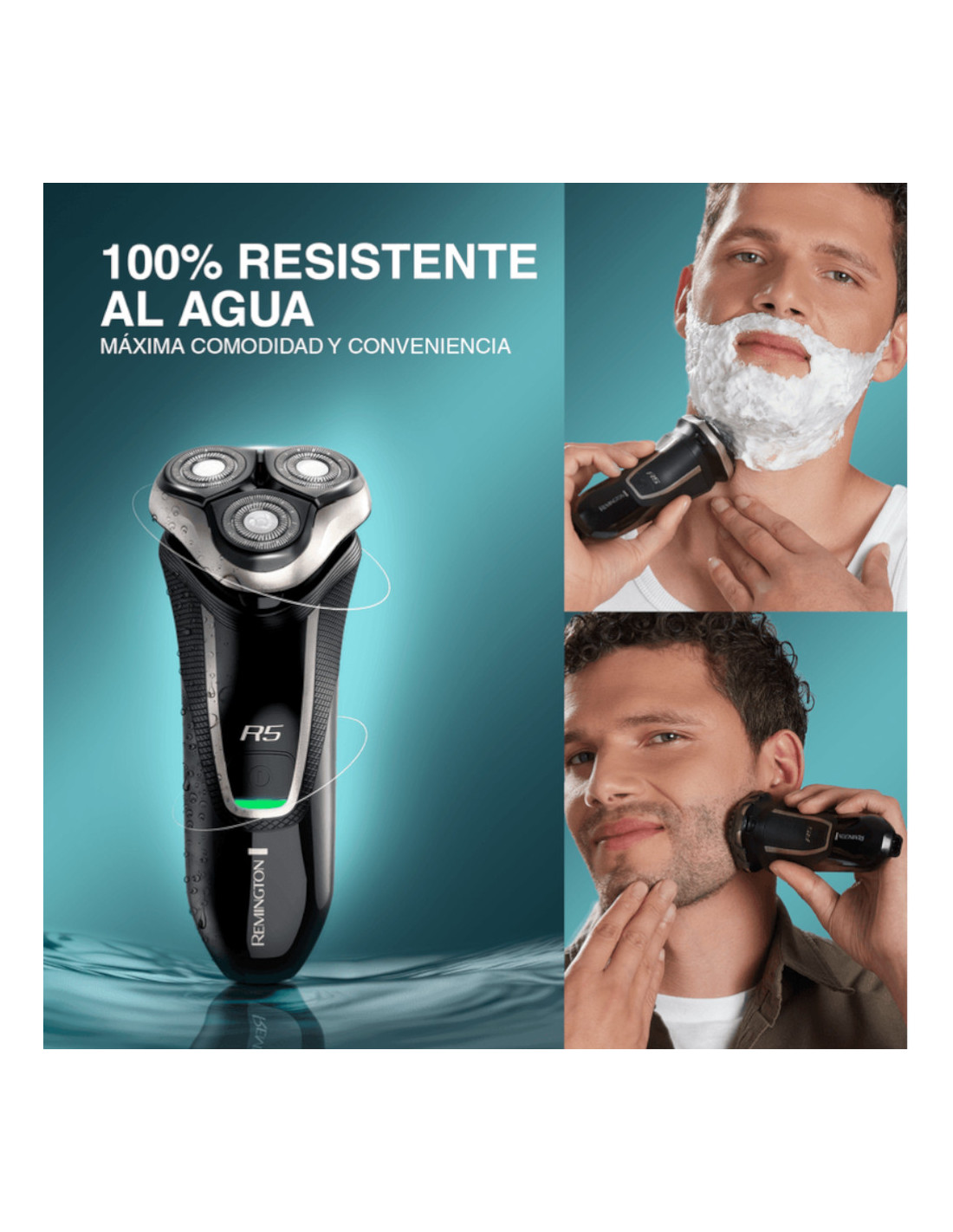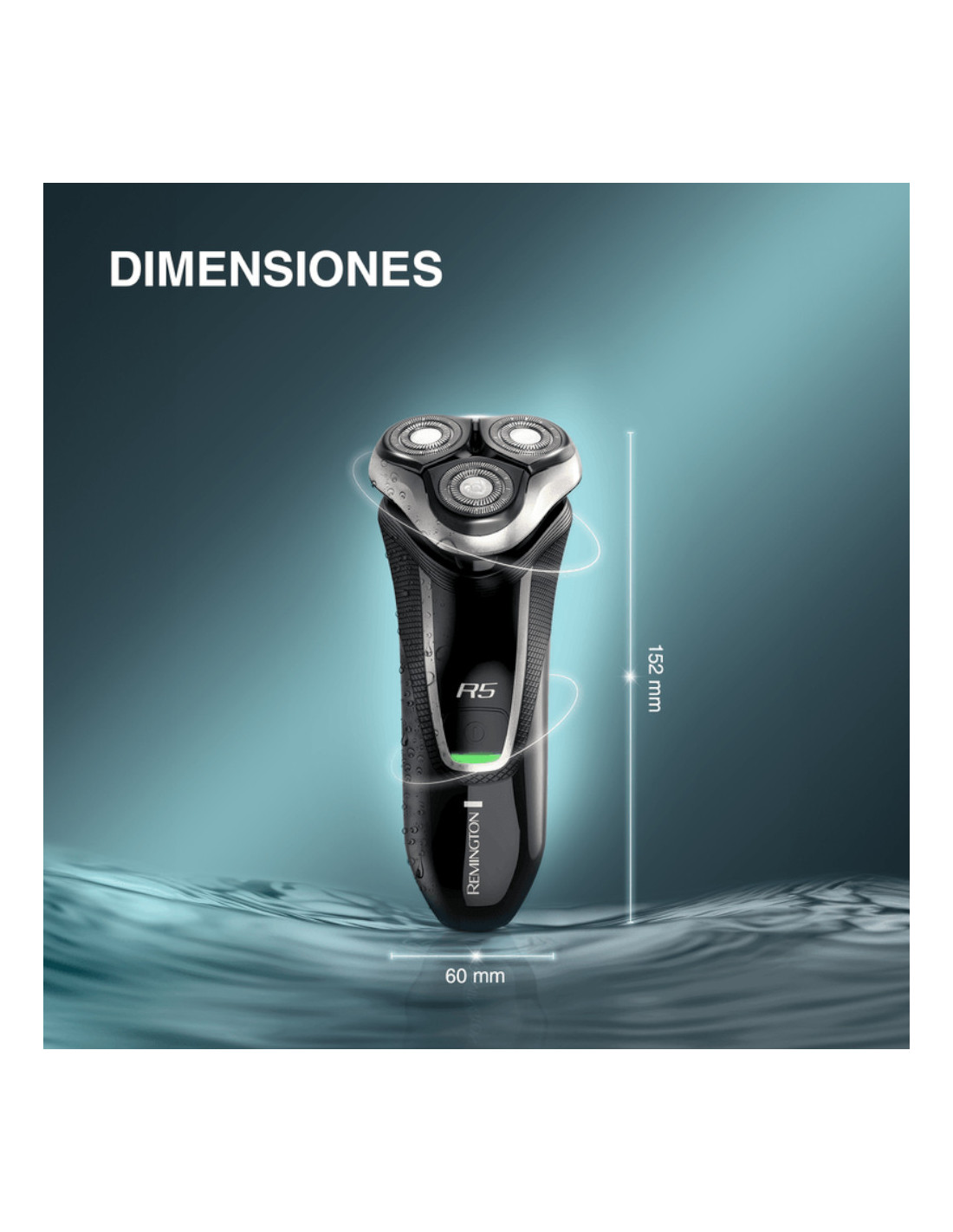 Mejora tu afeitado con la Remington R5 R5011:Cortadores de grafito aseguran un deslizamiento suave. Con 2 velocidades,60 min de uso inalámbrico y carga rápida de 5 min. Resistente al agua incluye cabezales Precisión plus y accesorio para barba.