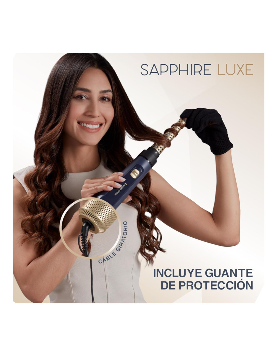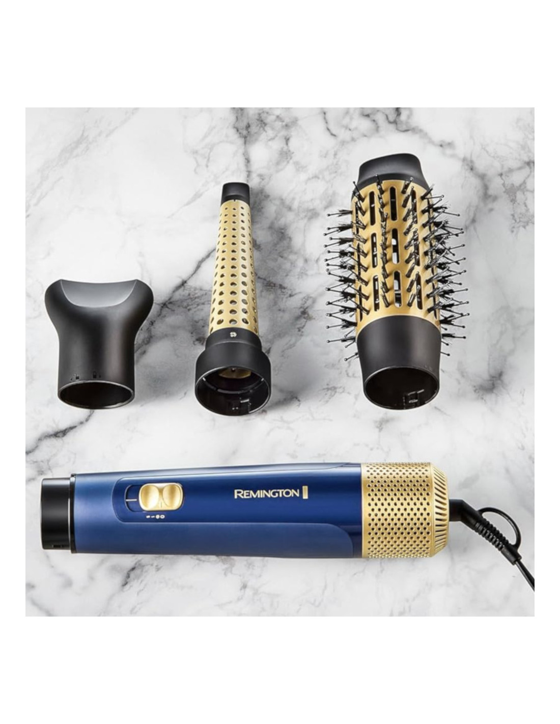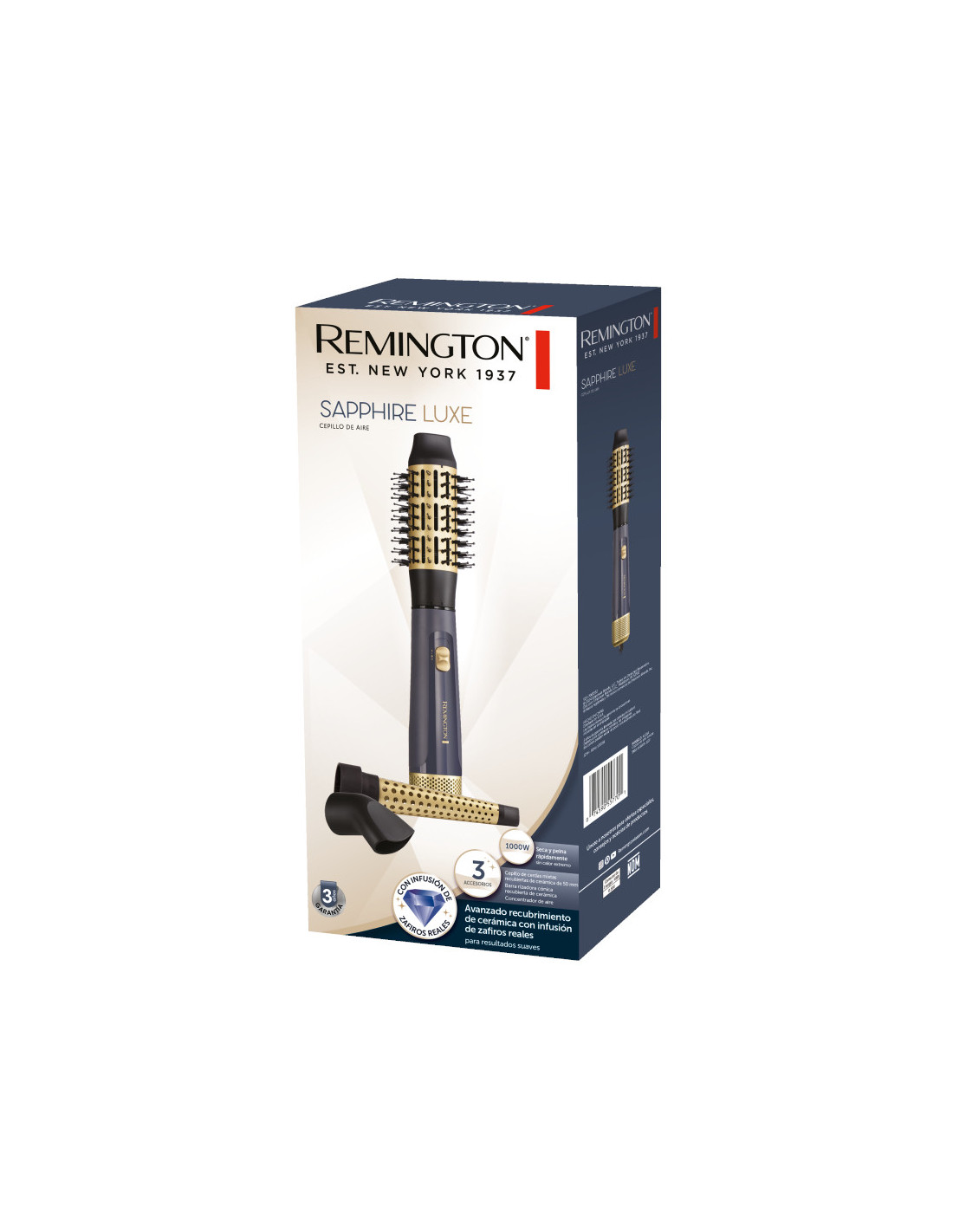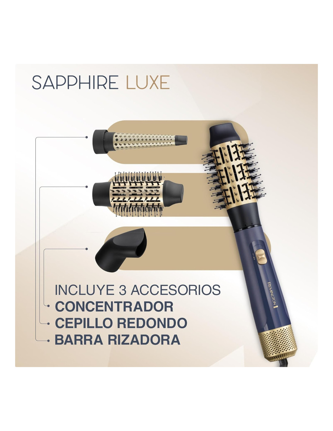 Descubre el Cepillo de Aire y Multiestilizador Remington AS5805-110F. Con revestimiento cerámico avanzado infundido con auténticos zafiros para un cabello suave y brillante. Incluye 3 accesorios de peinado: concentrador, cepillo redondo de cerdas mixtas y rizador cónico. Potente motor de 1000 W, 2 ajustes de temperatura y velocidad, ráfaga de aire frío y acondicionamiento iónico para un acabado sin frizz. ¡Estilo impecable garantizado!