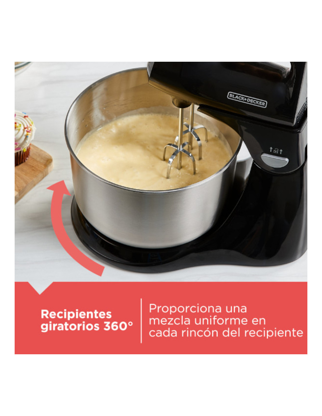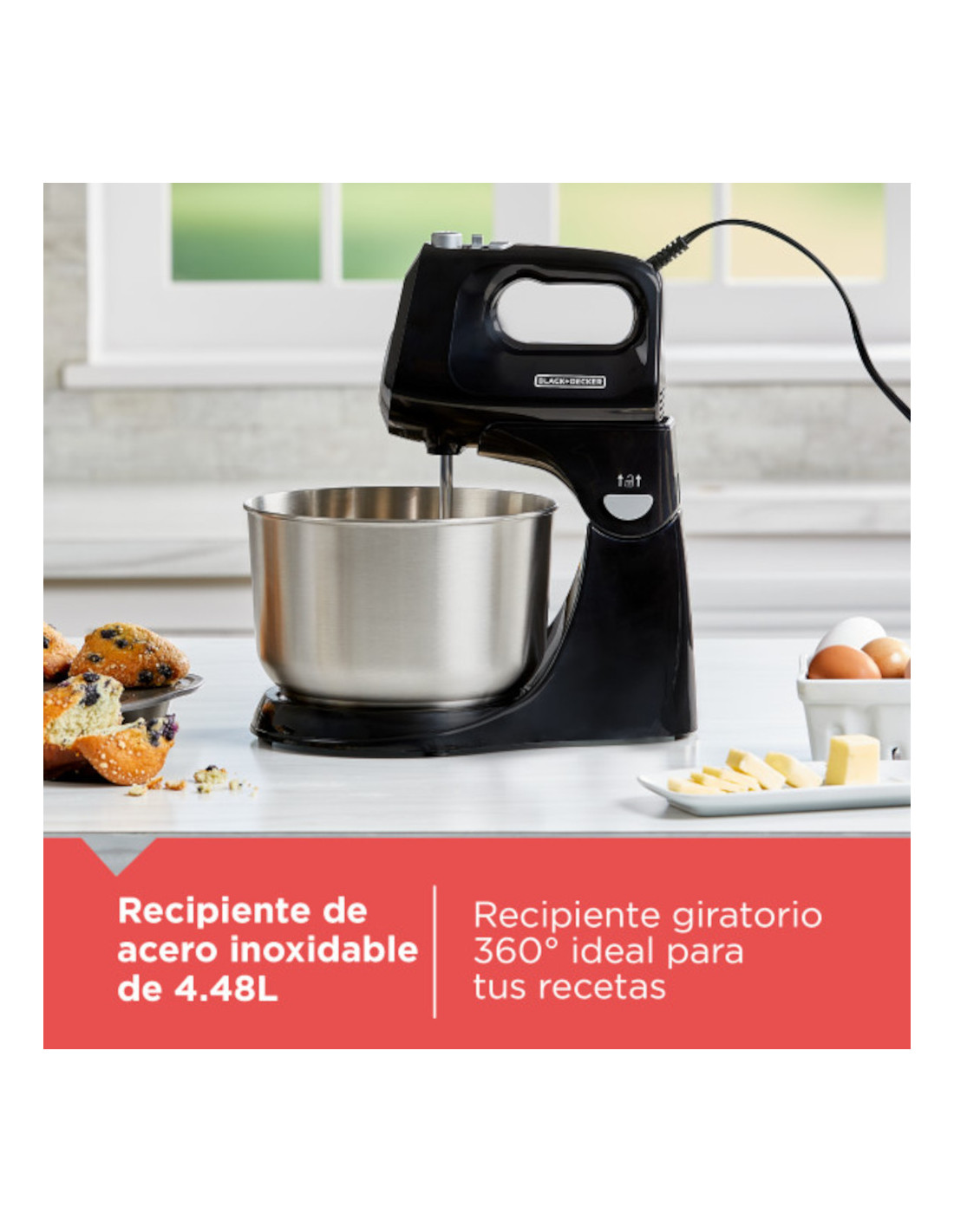* Incluye: 2 batidores de alambre, 2 ganchos para masa, 2 recipientes giratorios de acero inoxidable de 4.48L y vidrio de 3.9L