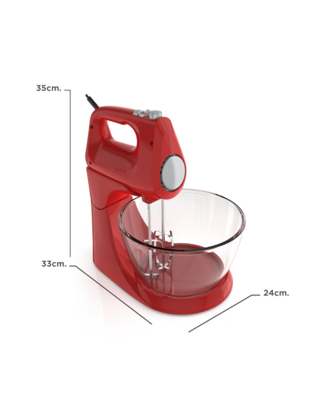 Fácil de convertir de batidora con pedestal a batidora manual Incluye: 2 batidores de alambre, 2 ganchos para masa y recipiente giratorio 360° plástico de 4.2L 5 velocidades + turbo Potente motor de 250W Talón de descanso Soporte para el recipiente Piezas lavables en maquina lavavajillas.